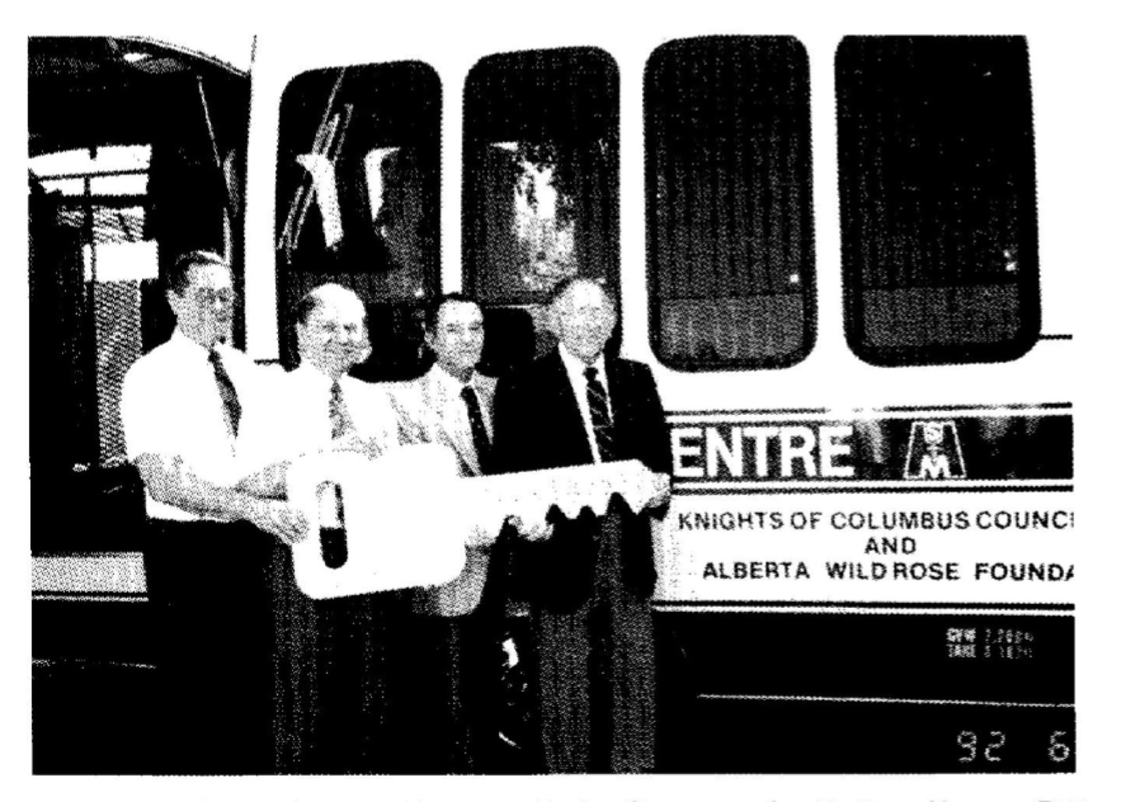 from our Council. In 1987, $2,750 was donated for the purchase of a Larynscope and later, the same year, $7,700 was donated for an A.T.S. Tourniquet. In 1991, J. Joevenazzo, as project chairman, made application to the Wild Rose Foundation for a grant of $15,000 for the purposes of purchasing a Handi- cap Bus for the hospital. The Council matched the grant and costs over $30,000 were assumed by the hospital board. A cheque in the amount of $15,000 dated December, 1991, was received from the Wild Rose Foundation under the signature of DickJohnston, M.L.A. and Ken Kowalski, M.L.A.